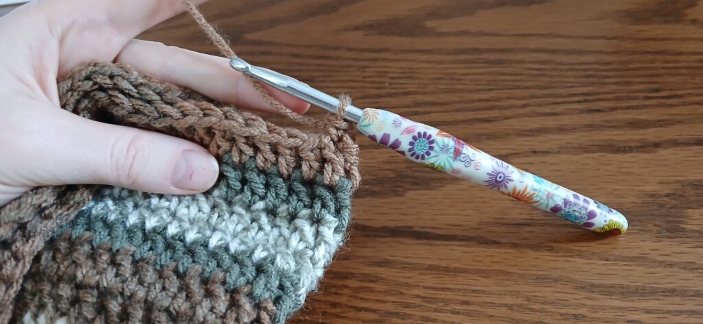 R4: Attach your yarn to the rim of your hat. Ch 2, dc in the same stitch and in the next, inc in the following